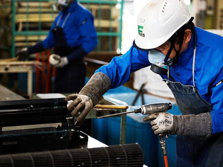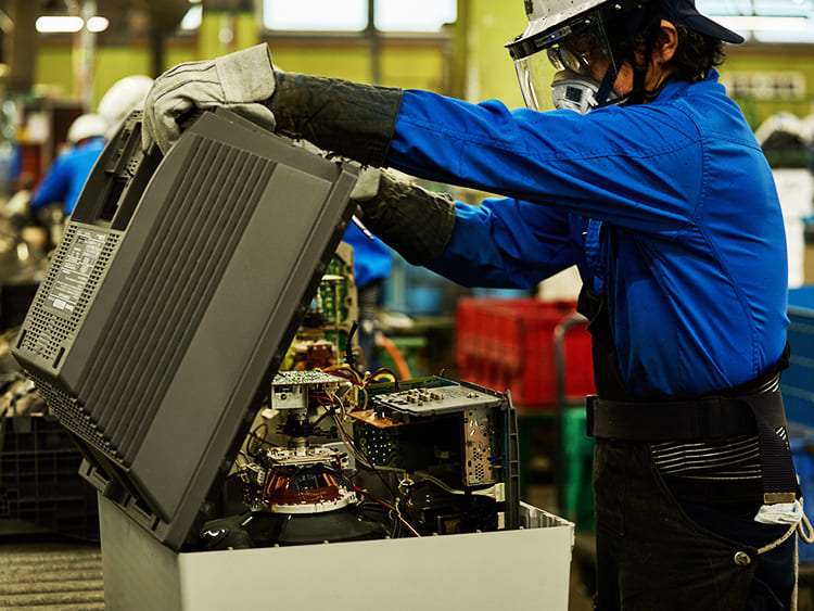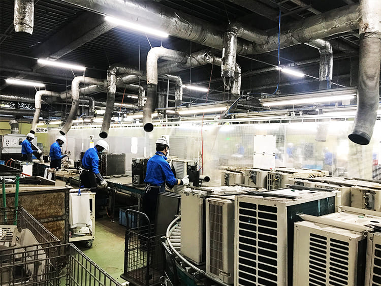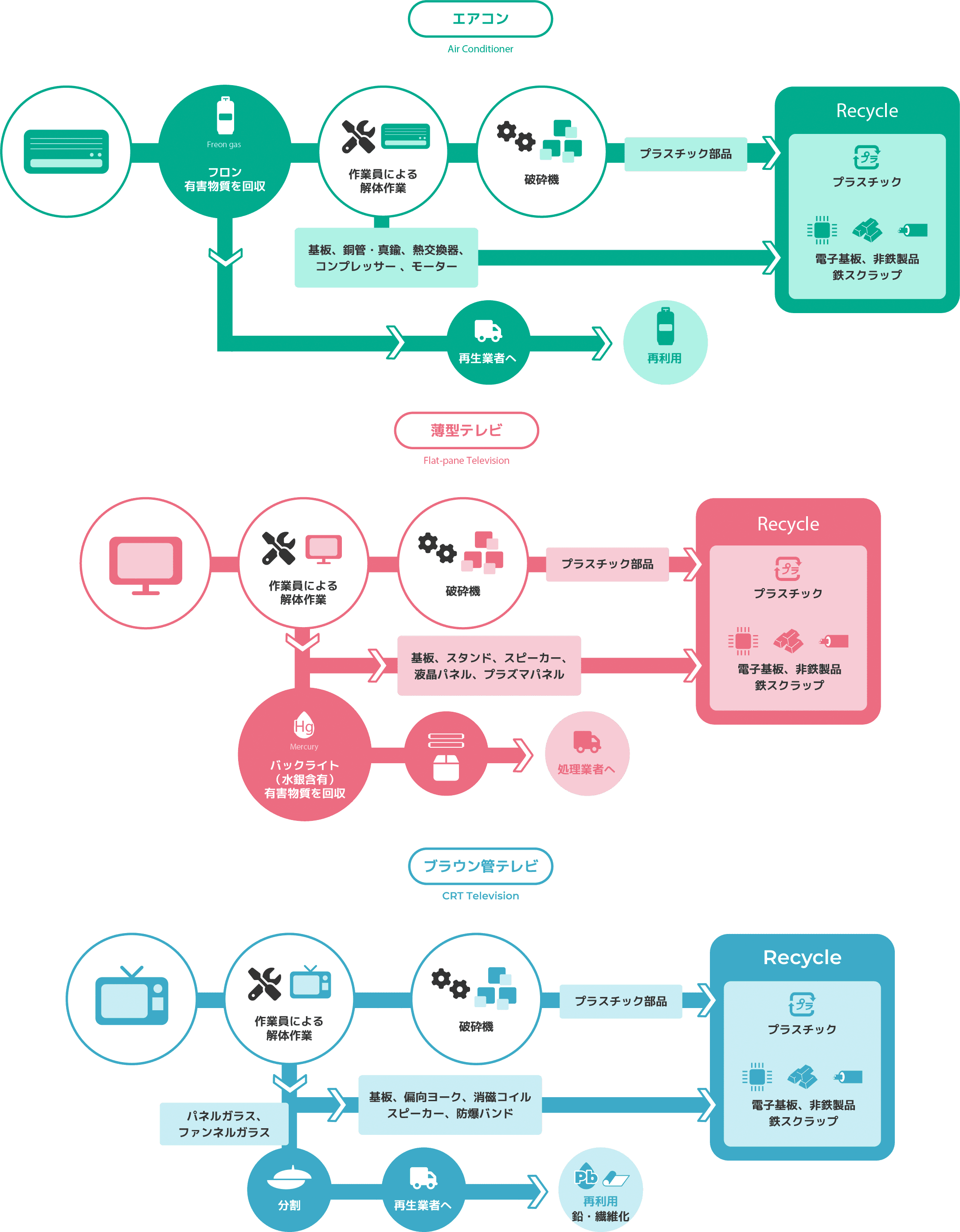 フューチャー・エコロジーでは指定引取り場所から入ってきた「ブラウン管テレビ」「液晶・プラズマ テレビ」「エアコン」を工程ごとに区切って解体を行っております。