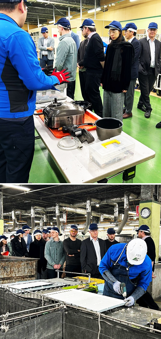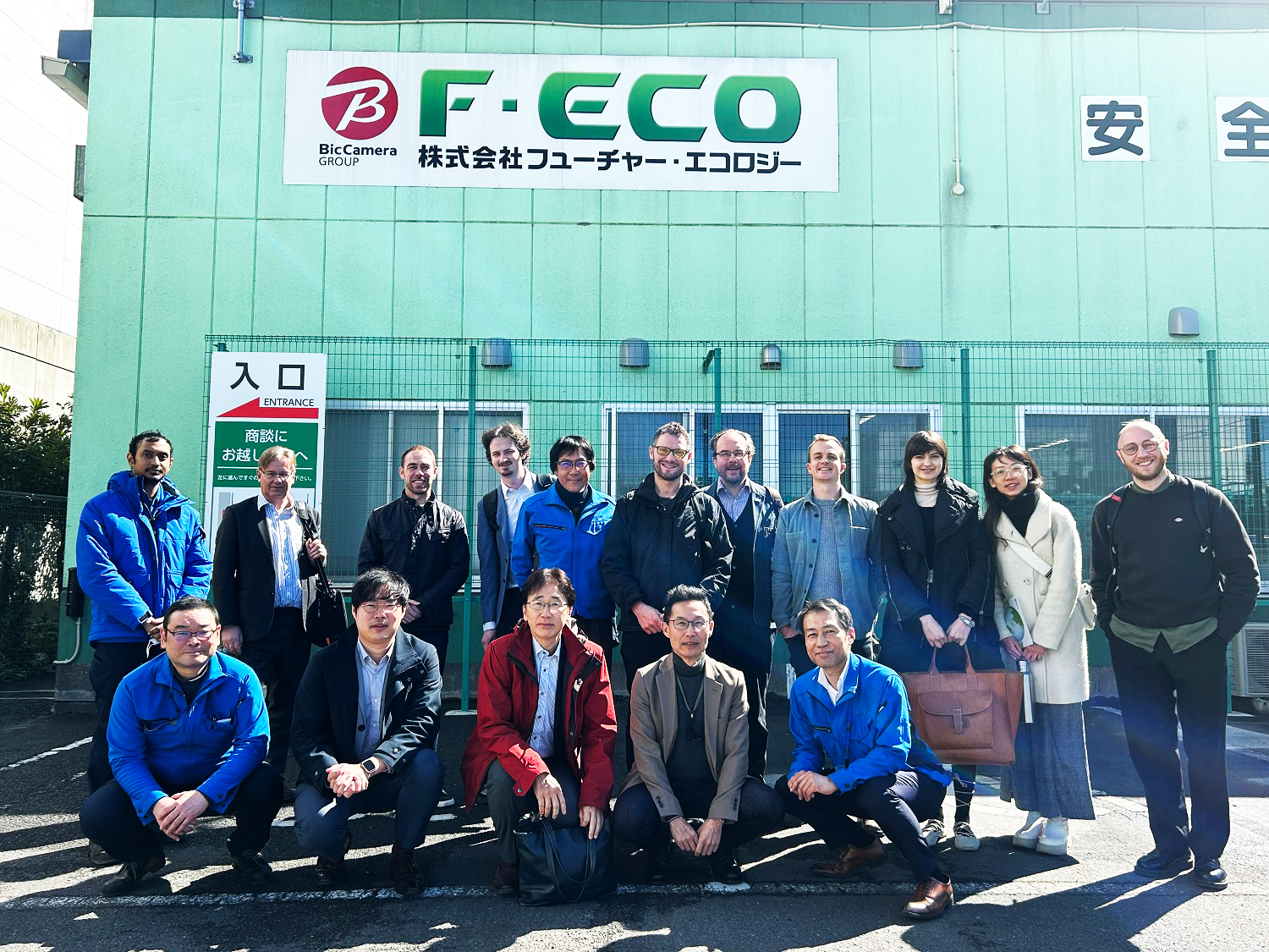 令和6年3月1日(金)にイギリス政府公的助成機関「Innovate UK」をはじめに複数の関連企業の方々が当社に視察に来られました。 当社では、東京都の「令和5年度革新的技術・ビジネスモデル推進プロジェクト(調査・分析事業)」における小型家電由来の廃プラスチックマテリアルリサイクル検証状況をご紹介するとともに、テレビ・炊飯器の解体作業をご覧いただきました。