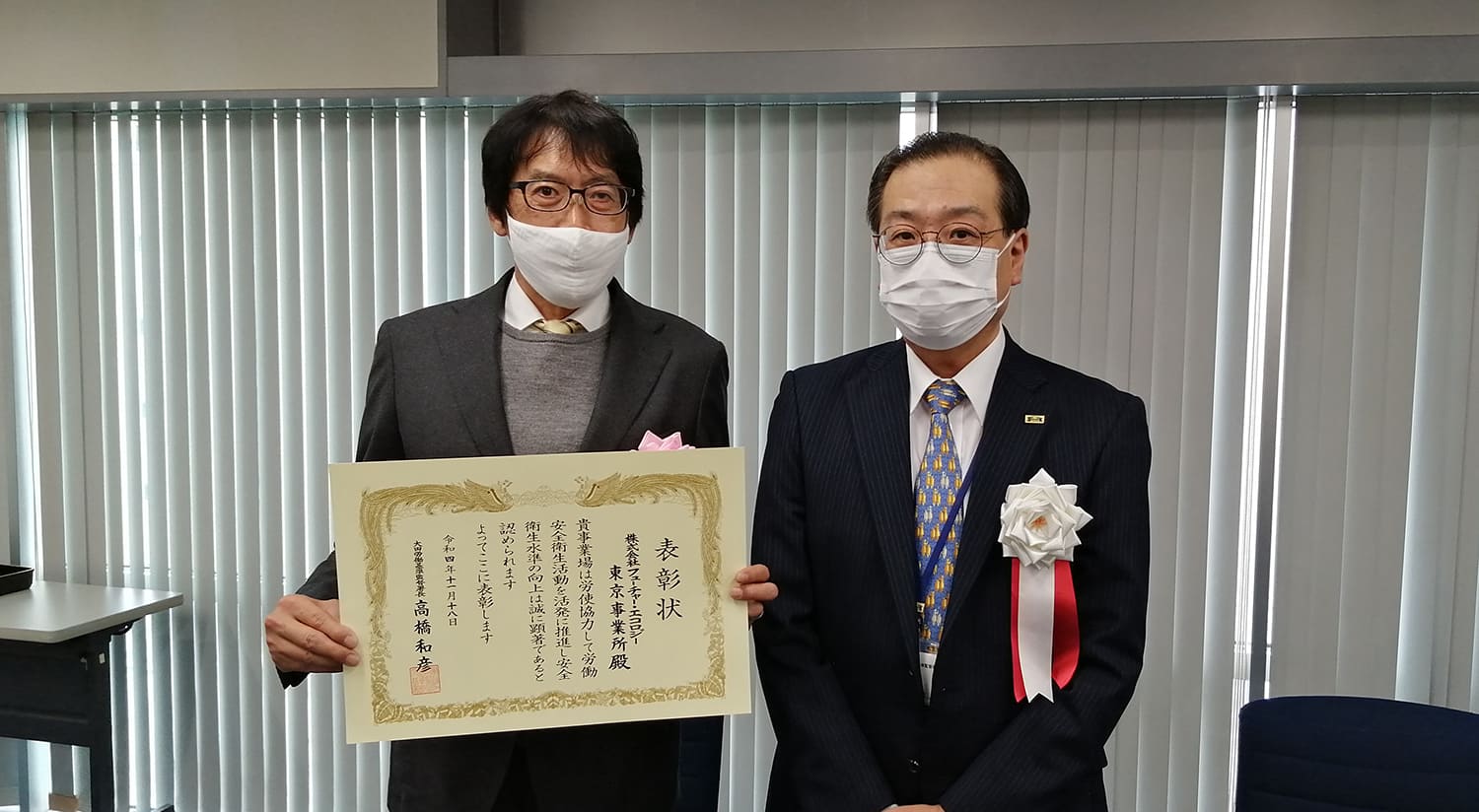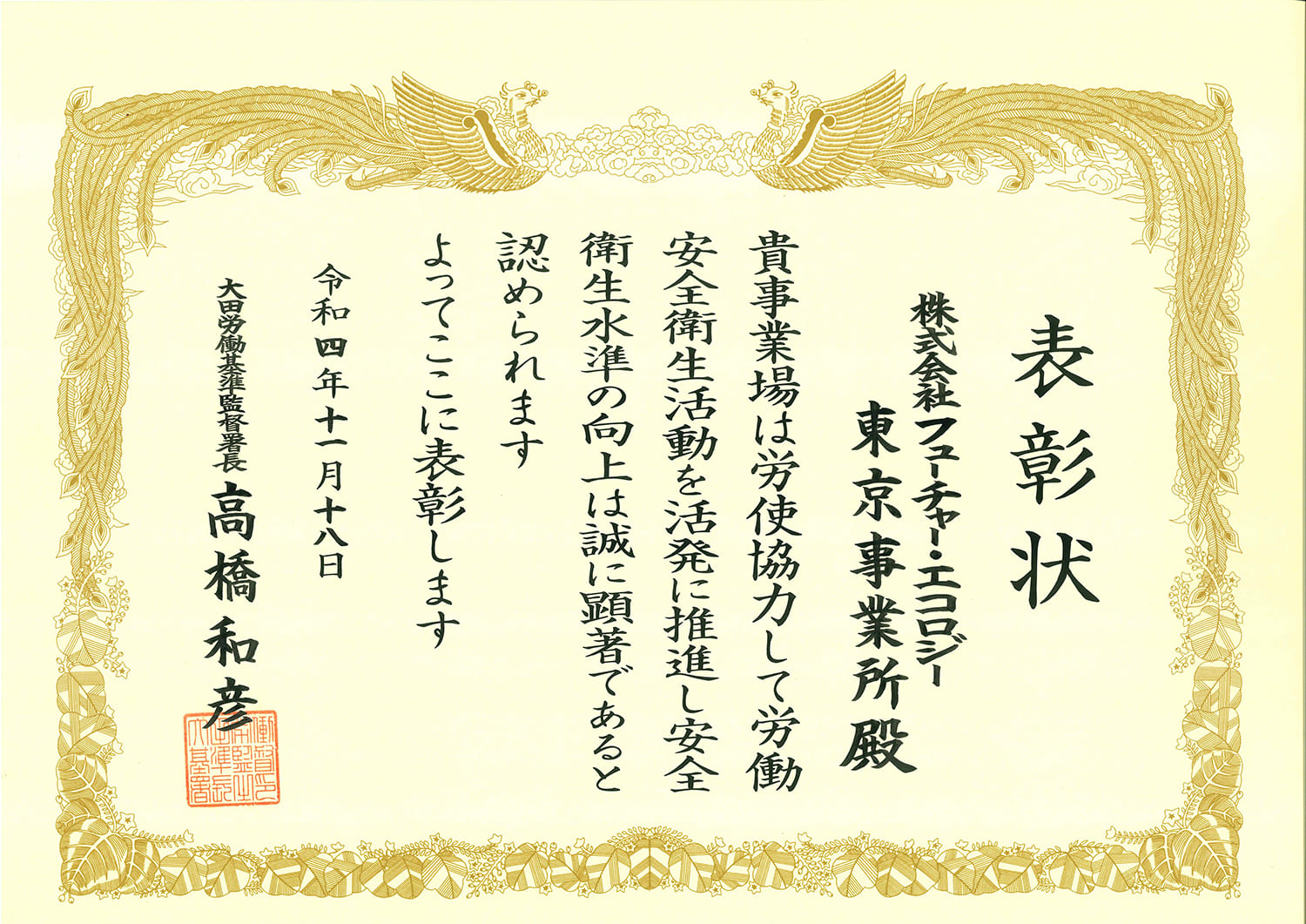 この度、大田労働基準監督署より、日頃の安全衛生管理活動の成果が認められ表彰されました。