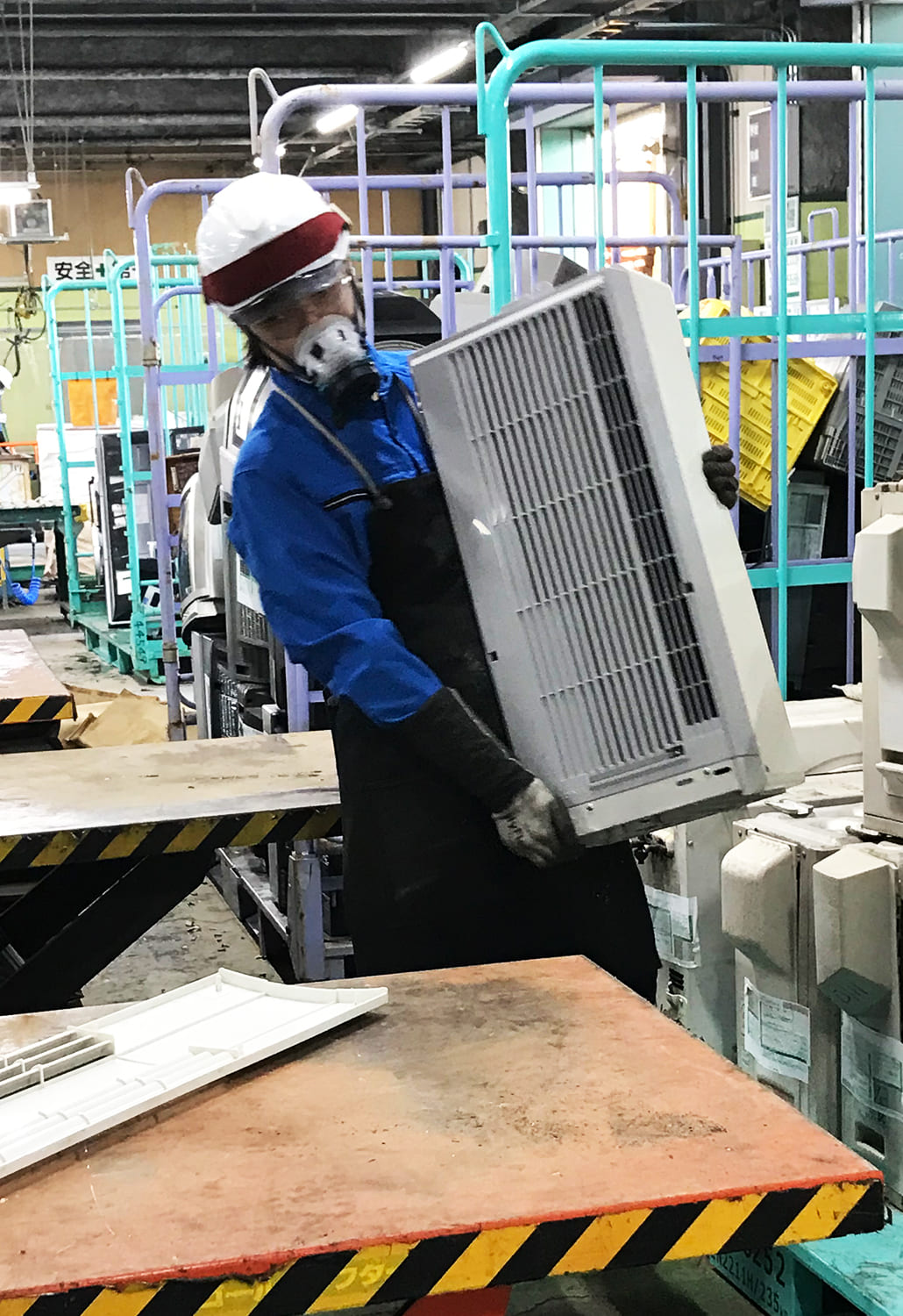 最初は使用済み家電製品の解体業務のみ行っていましたが、今ではフォークリフトの運転も出来るようになりました。 担当するエアコンの解体では、主に室外機からフロンガスを抜いています。正しく処理をしなければ地球温暖化やオゾン層の破壊という悪影響を及ぼしてしまう為、きちんと回収しなければなりません。私達の仕事は、ただ使用済み家電製品を解体し資源にするだけではなく、環境に配慮して安全に再資源化を行う事にあるからです。