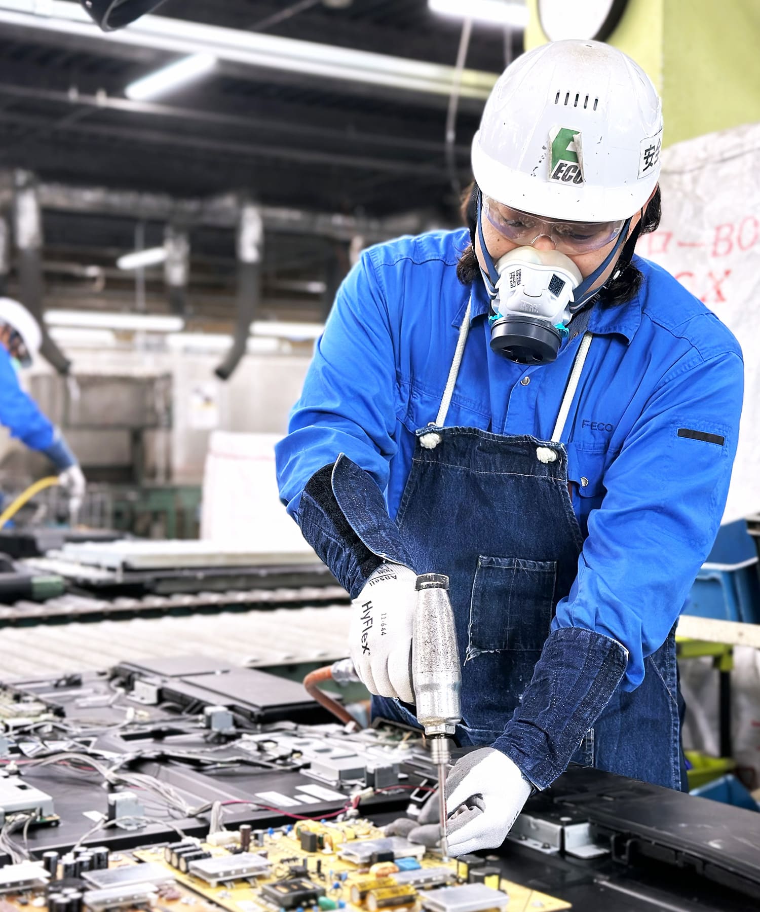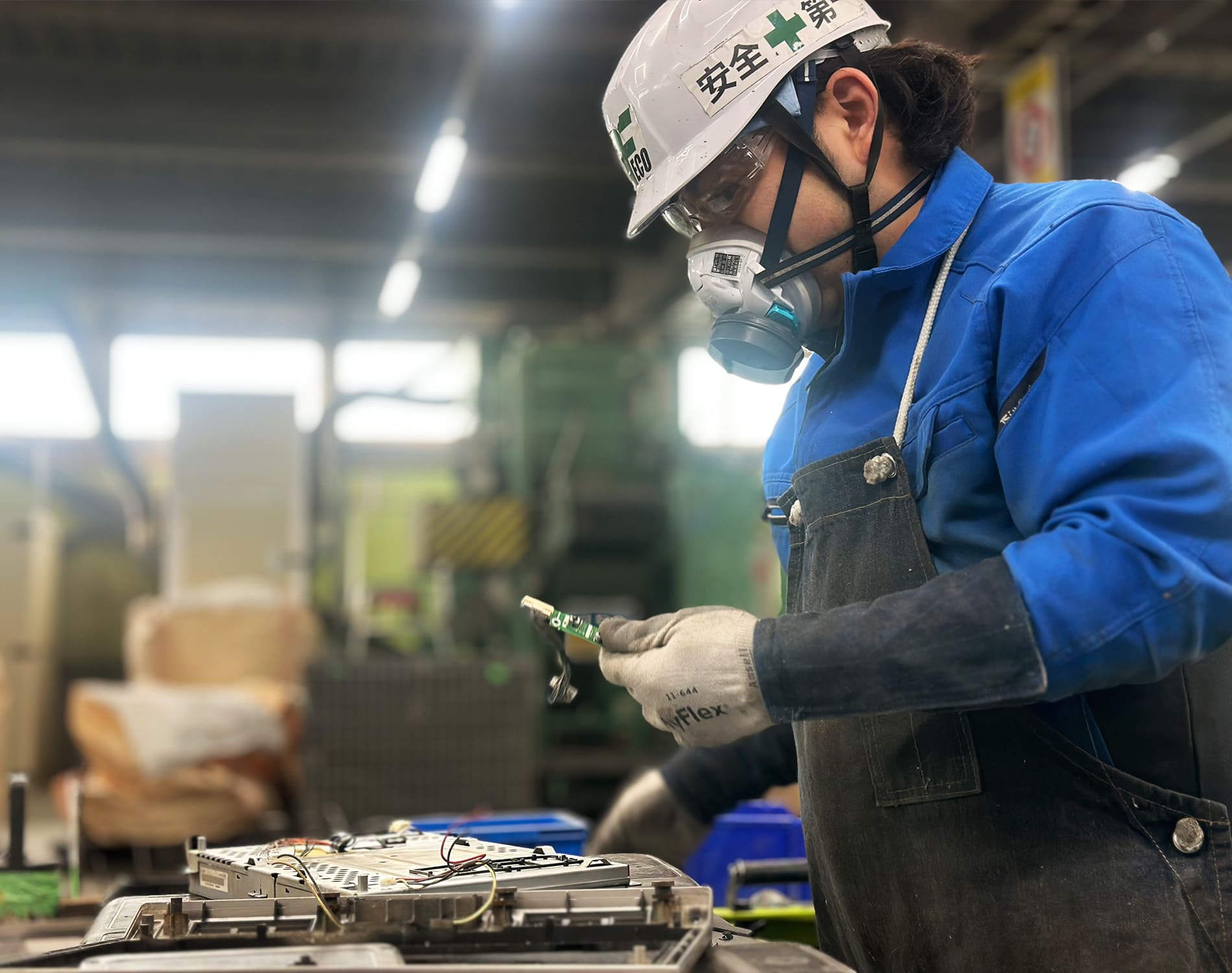入社後初めは薄型テレビの解体業務から行い、ブラウン管テレビ、エアコン室内機、エアコン室外機の解体も行える様になりました。ただ単に解体するのではなく、回収物がどのように処理されリサイクルされているかを確認する為、現地確認に赴き、現場を知る事によって資源循環の重要性を学んでいる最中です。